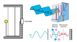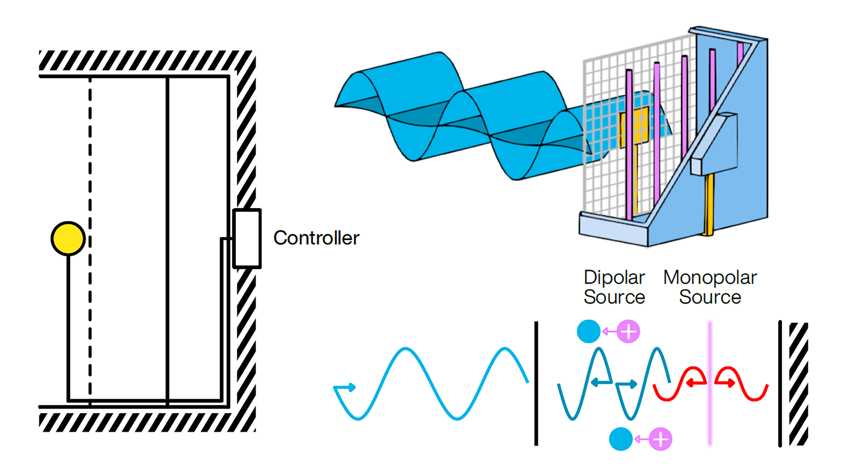 Schematic illustration of the Plasmacoustic Metalayer™ showing how plasma-based acoustic emitters operate to cancel incident sound, achieving true absorption.
